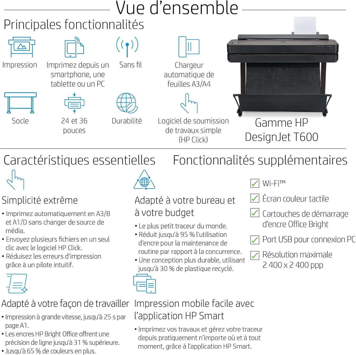 | Description | Le traceur HP DesignJet T630 est une imprimante grand format compacte et performante, idéale pour les professionnels de l’architecture, de l’ingénierie et du design. Avec son format A0 de 36 pouces, il offre une impression mobile rapide et une connectivité complète. |